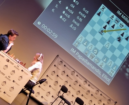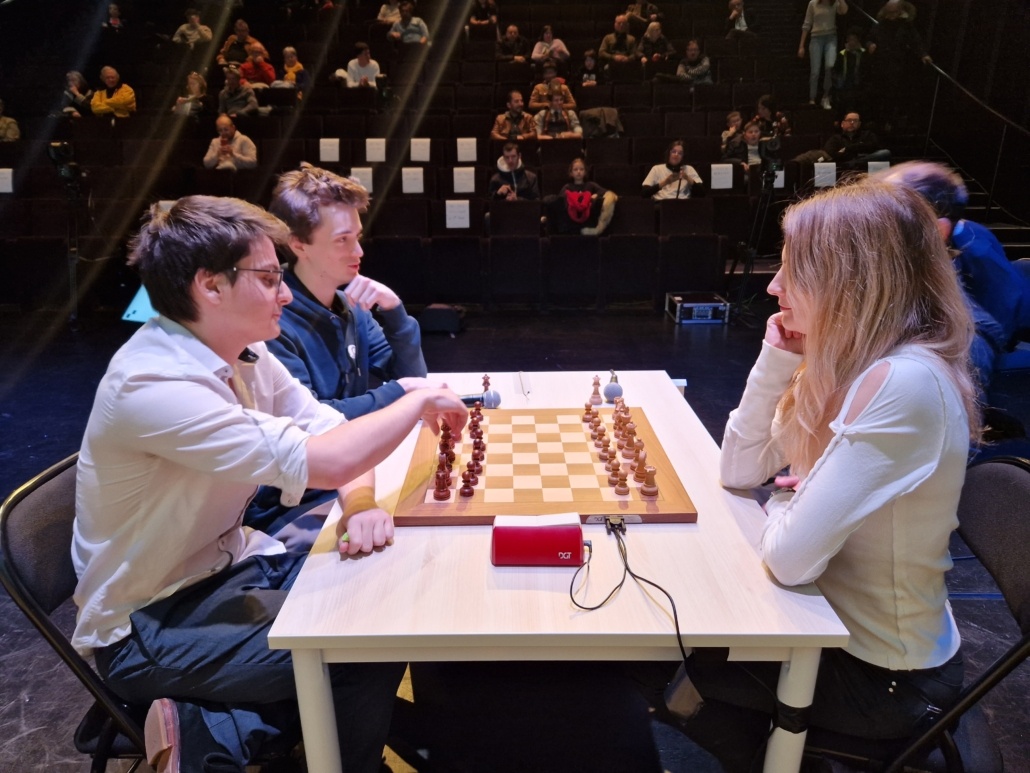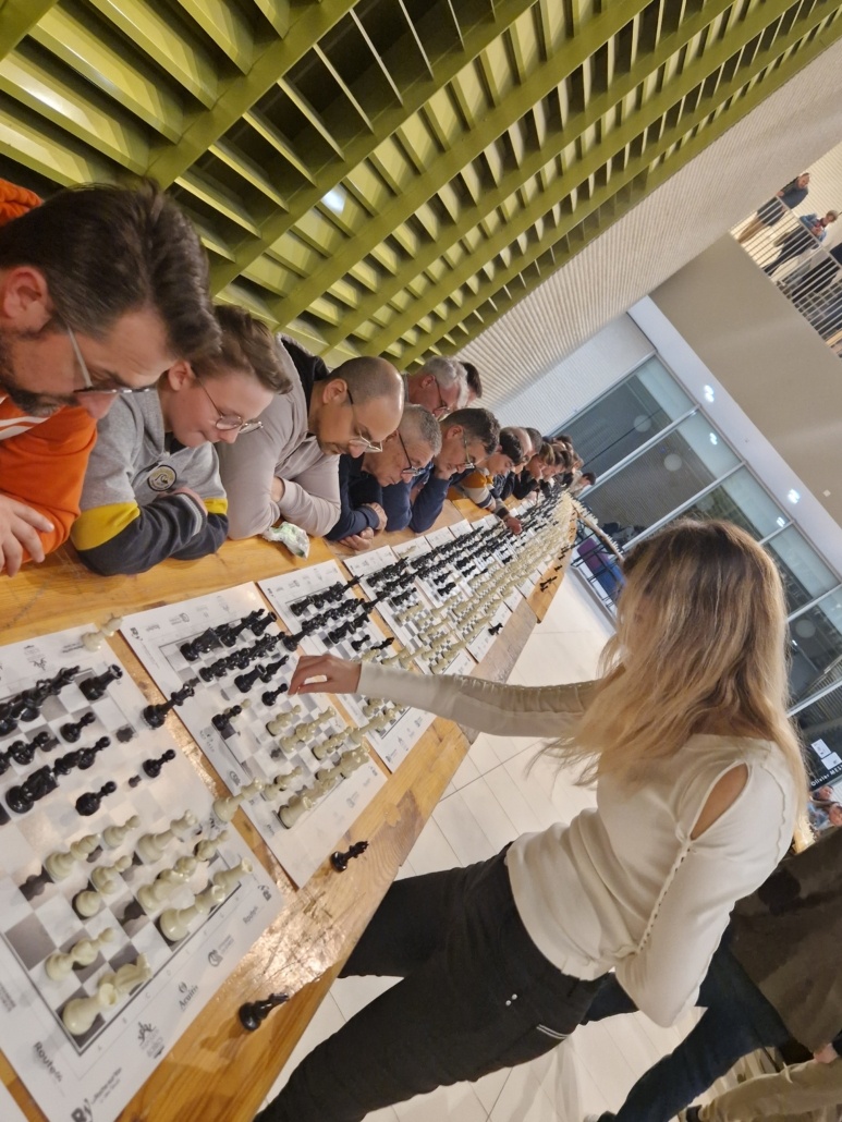 A l’issue de la remise des prix, place au bouquet final de ce TNE 2023, avec la désormais quasi mythique simultanée géante, qui voyait les 4 champions affronter 104 adversaires amateurs, record de participation battu ! La jauge maximale était atteinte, et durant deux bonnes heures les pros des échecs passaient de table en table, engrangeant autant les victoires que les kilomètres parcourus. L’épreuve est physique, mais avant tout très sympa, conviviale, puisque les coups sont joués entre deux brèves discussions avec les amateurs, dont certains tiraient très bien leur épingle du jeu, donnant parfois du fil à retordre aux Maîtres. D’autant que ces derniers, parfois facétieux, se succédant les uns après les autres sans ordre établi, laissaient parfois traîner quelques « mines » à leurs petits camarades ! Un exemple typique de l’ambiance qui peut régner lors de cet événement, qui s’était assuré plusieurs partenariats de soutien locaux, comme la maison d’optique et d’audition Acuitis, ou le cabinet d’expertise-comptable Bamex, qui par ailleurs accompagne la société Route64 tout au long de l’année. Un engouement local est né, preuve en est que la Fédération Française des Echecs a confié à la Ville de La Roche-sur-Yon et Route64 l’organisation des 4 finales des coupes de France, qui se dérouleront dans la préfecture vendéenne les 1er et 2 juillet. « Nous voulons faire de la Vendée une terre d’échecs », dévoilait le maire et président de l’Agglo, Luc Bouard, qui envisage de développer le jeu sous toutes ses formes et à destination de tous publics.